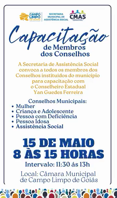 A Secretaria Municipal de Assistência Social convida todos os membros dos Conselhos instituídos de Campo Limpo de Goiás para uma importante capacitação com o Conselheiro Estadual Yan Guedes Ferreira.